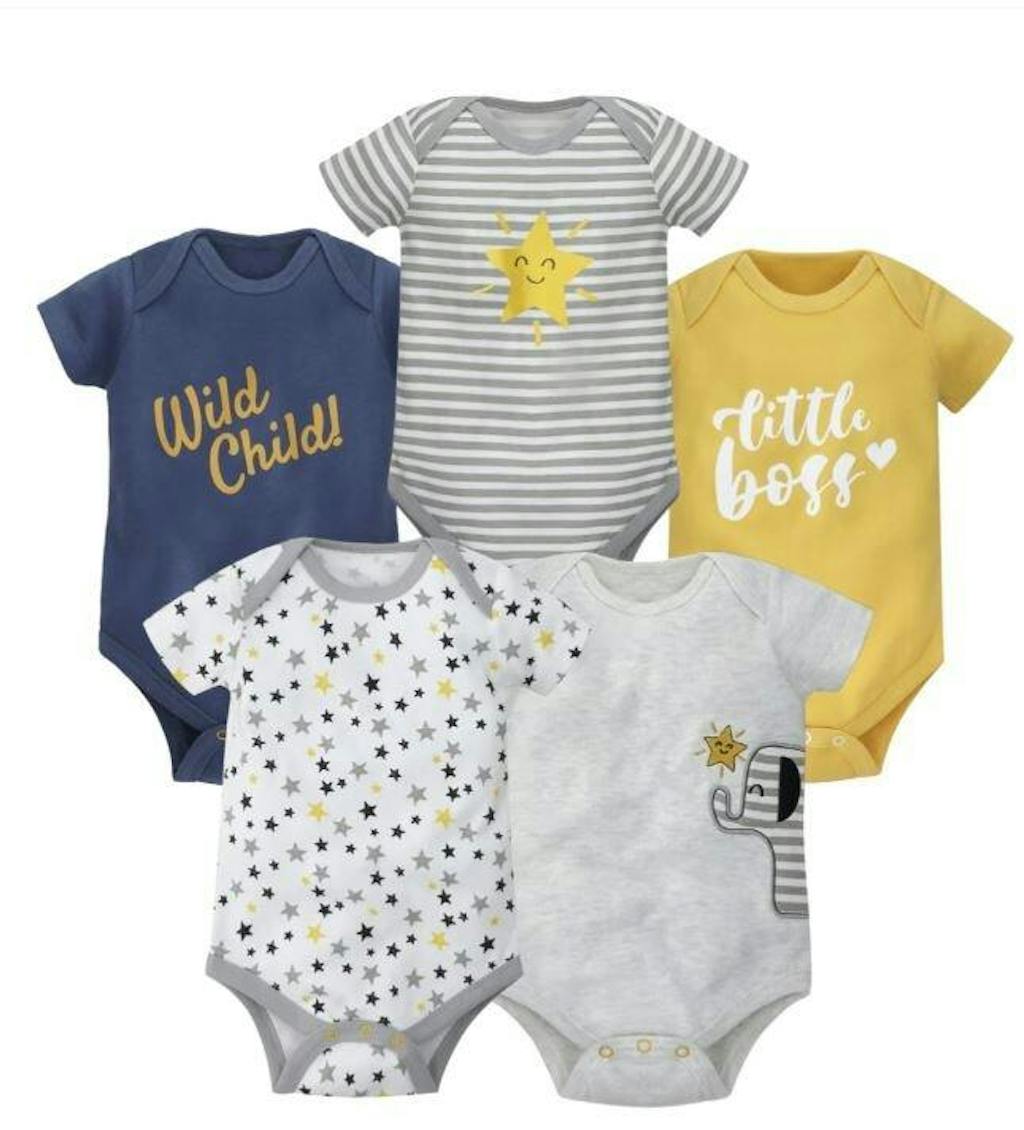This adorable set of half-sleeve bodysuits comes in a mix of fun prints, including a playful grey elephant graphic, cheerful stars, stripes, and slogans. Perfect for layering or wearing on their own, these bodysuits are designed with easy snap closures for hassle-free diaper changes.