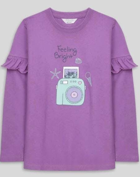 This purple tee features ruffled long sleeves, a ribbed crewneck, and a fun “Feeling Bright” graphic with a cute illustrated camera, sparking creativity in little minds.
